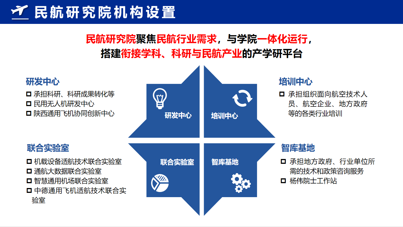 304永利集团官网入口聚焦人才培养和学科建设,与研究院一体化运行,以绿色航空、智慧民航、航空安全与管理三大特色方向为引领,着重打造九大研究中心,助力航空宇航科学与技术和力学学科建设。民航研究院聚焦民航行业需求,与学院一体化运行,搭建衔接学科、科研与民航产业的产学研平台。