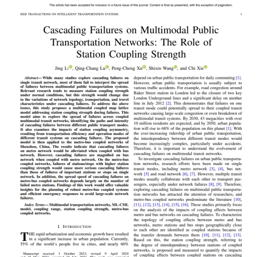 近日,智能交通领域国际著名期刊《IEEE Transactions on Intelligent Transportation Systems》(中科院1区、TOP期刊,IF=7.9)刊登了我校新葡8883官网AMG官网博士研究生李静发表的学术成果“Cascading Failures on Multimodal Public Transportation Networks: The Role of Station Coupling Strength”(站间耦合强度在多模式公共交通网络的级联失效中的作用)。李静同学为第一作者,我校路庆昌教授为通讯作者,新葡8883官网AMG官网为第一署名单位和通讯作者单位,同济大学知名学者合作参与完成。该项研究得到了国家自然科学基金重点项目和面上项目的资助。