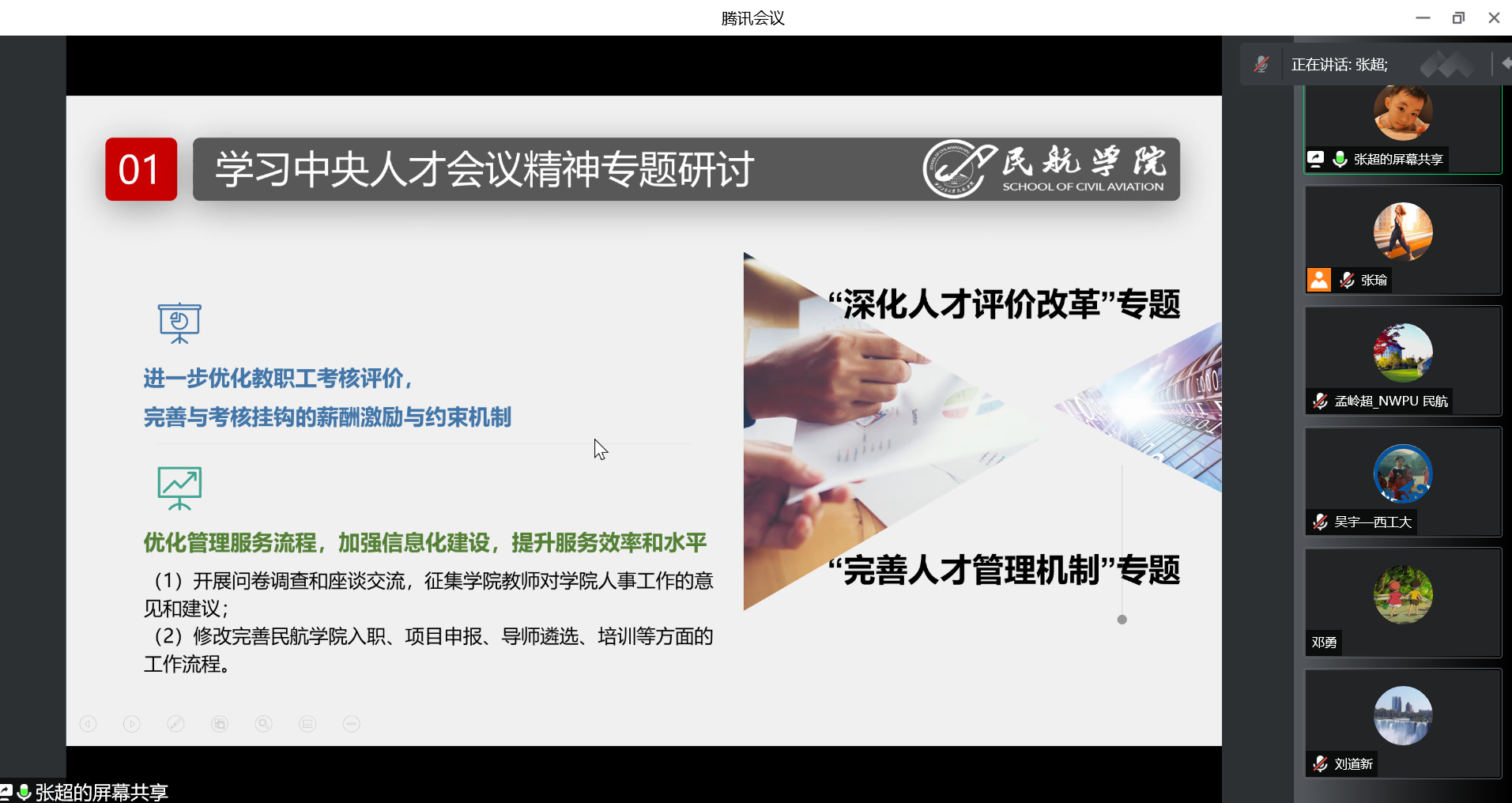 首先,张超副院长传达了汪劲松校长在新学期干部大会暨人才工作会议启动会上讲话的精神和主要内容,并对学院人才工作会议方案进行汇报,依次介绍了学院师资队伍的现状、高层次人才培育情况,结合学院“十四五”师资队伍规划,介绍了本年度“十四五”人才引进规模、学院人才项目工作进展情况及具体举措;并就近期学院人才工作做了部署与安排。