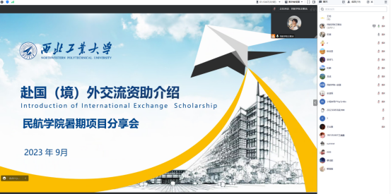 会上,304永利集团官网入口2023年暑期海外交流项目的带队老师代表田薇、和麟,从出国(境)交流项目的申请条件、获资助情况、交流收获及交流期间了解到当地留学申请的条件和优势做了详细的介绍,鼓励同学们尽早明确目标,提前规划,把握出国(境)交流学习的机会。学生代表赵瑨(博士生)、吴沛坤(本科生)分别从自身角度出发,向与会的全体学生分享出国参加此次暑期项目的心得与收获,他们坦言,此次交流不仅让他们了解到国外先进的航空宇航知识,体验了当地的风土人情,更增长了见识,坚定了他们要学好本领、航空报国的决心。
