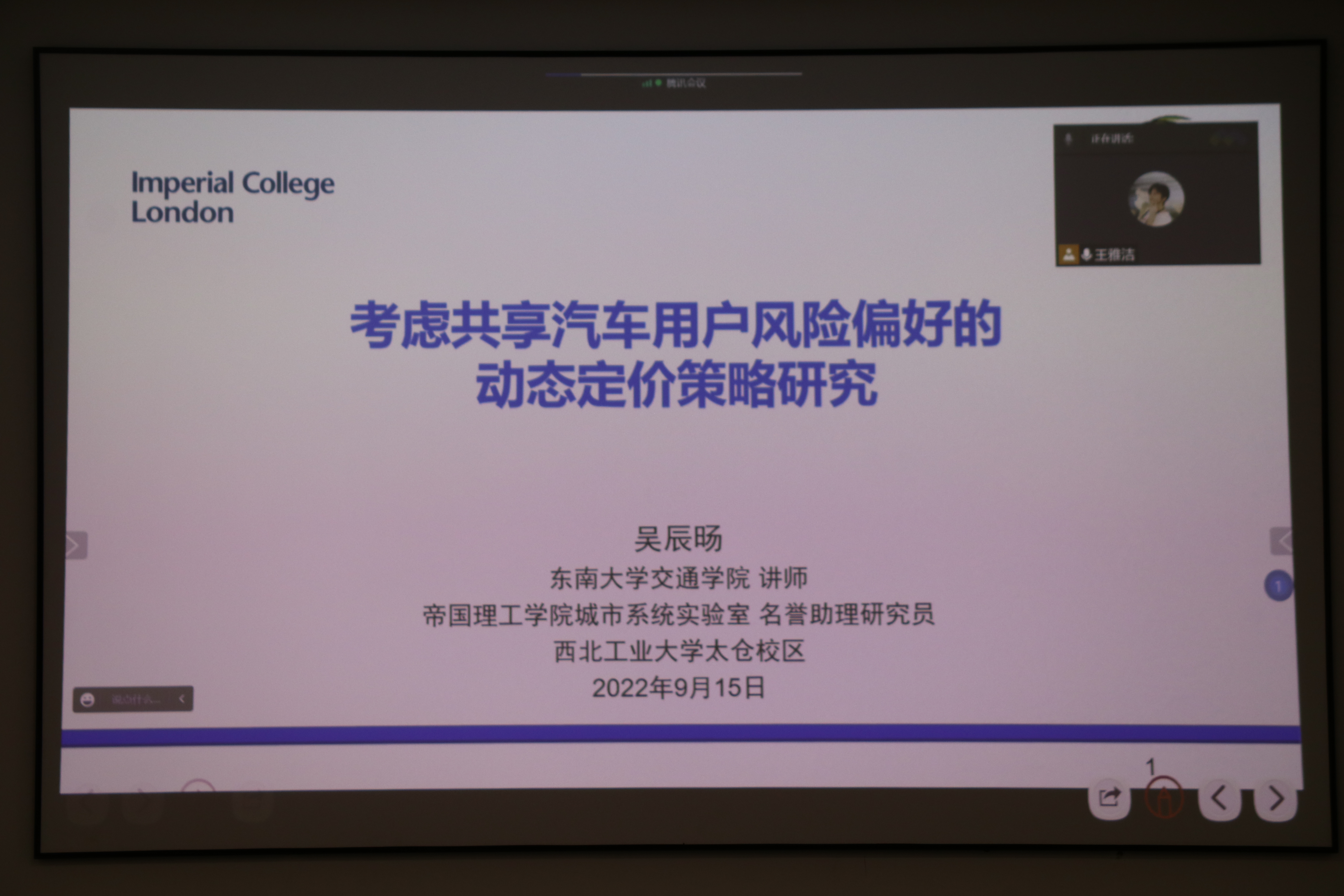9月15日下午,应永利集团官网邀请,东南大学交通学院讲师、帝国理工学院博士吴辰旸在太仓智汇港C210会议室作了题为“考虑共享汽车用户风险偏好的动态定价策略研究”的学术报告。此次报告采取线上、线下相结合的方式进行,由学院副教授孟岭超主持。学院院长李玉龙、党总支副书记(主持工作)闫伟,以及其他青年教师和研究生参与了交流。