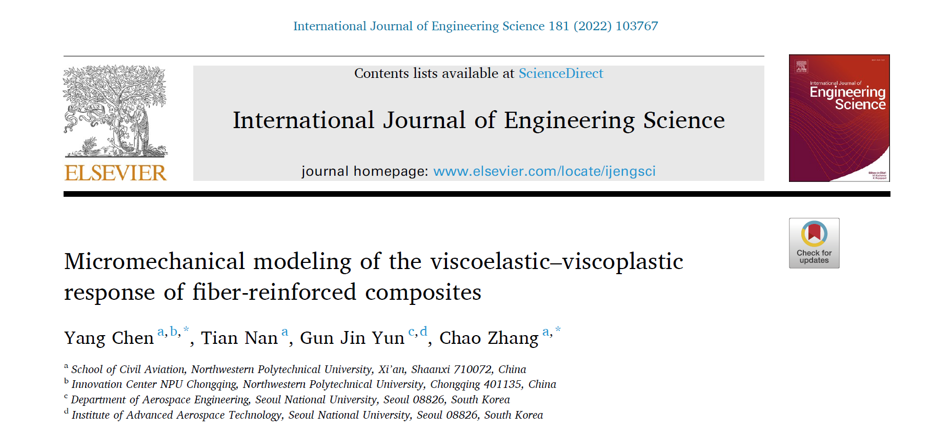 近日,304永利集团官网入口的副教授陈杨和学院教授张超合作,建立了纤维增强复合材料基于细观力学理论的粘弹-粘塑性本构模型,实现了复合材料非线性弹塑性响应、应变率效应和蠕变/松弛行为的准确和快速预报。该理论模型可应用于复合材料的多尺度仿真分析中以显著提升仿真效率。该研究成果发表在工程技术和力学领域顶刊《International Journal of Engineering Science》上。
