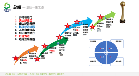 接下来,主讲人围绕“增压一生之路”的主题,详细介绍了如何围绕动力机械工程这样一个主线,从一个国家事业单位的工作人员成长为世界500强公司的研发高管,又成为了一个科技型民营企业创始人的职业经历。他表示,只有不断设定新的目标,不断跳出自己的舒适区,才能不断走向新的职业高度。