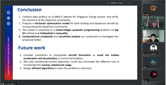 11月17日晚,来自新加坡科技研究所(A*STAR)的高级研究员(Senior Scientist)张逸成博士应永利集团官网副教授闫浩的邀请,为民航国际讲坛作题为“考虑起飞不确定性的机场滑行道联合调度问题研究”线上讲座,学院多名师生参加了此次讲座,讲座由闫浩主持。
