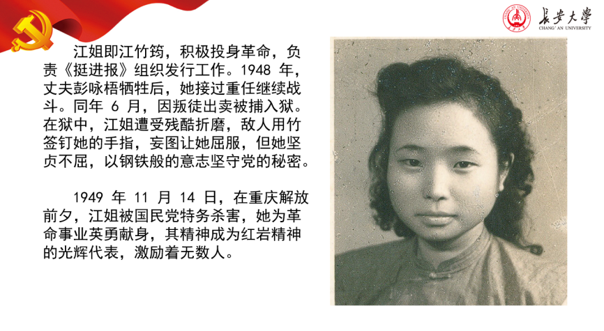 江姐即江竹筠,她积极投身革命,负责《挺进报》组织发行工作。1948 年,丈夫彭咏梧牺牲后,她化悲痛为力量,毅然接过重任继续战斗。同年6月,因叛徒出卖被捕入狱。在狱中,江姐遭受残酷折磨,敌人用竹签钉她的手指,妄图让她屈服,但她坚贞不屈,以钢铁般的意志坚守党的秘密。1949 年重庆解放前夕,江姐被国民党特务杀害,为革命事业英勇献身,她的精神成为红岩精神的光辉代表。