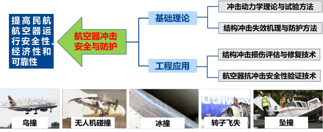 实验室以提高民航航空器运行的安全性、经济性和可靠性为目标,从基础理论和工程应用两个层面出发,设立了冲击动力学理论与试验方法、结构冲击失效机理与防护方法、结构冲击损伤评估与修复技术、航空器抗冲击安全性验证技术四个研究方向。