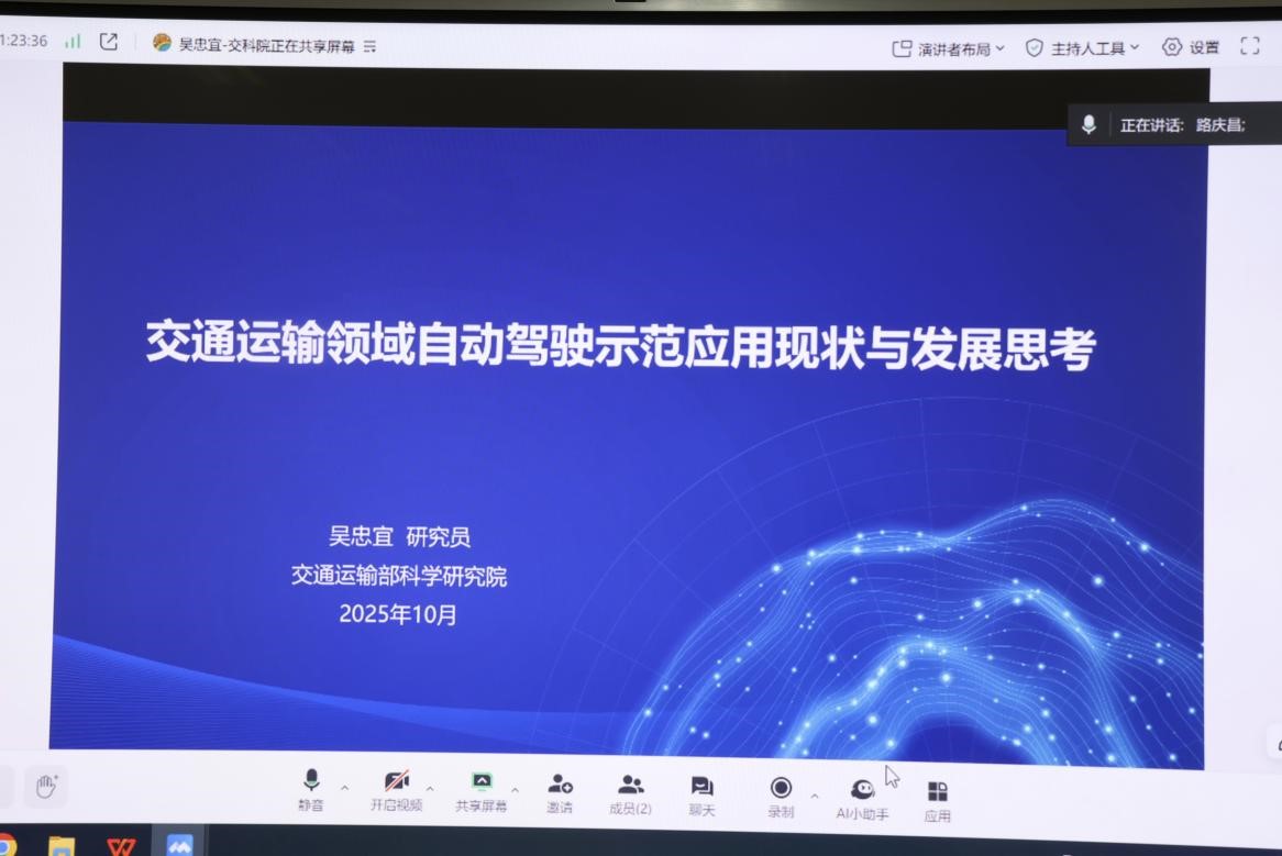 为交流交通运输领域前沿进展,搭建学术交流平台,拓展师生学术视野,10月16日下午,新葡8883官网AMG官网于WM3404教室举办“交通运输领域自动驾驶示范应用现状与发展思考”学术讲座——“电控讲坛”第5期。本次线上讲座由学院副院长路庆昌主持,特邀交通运输部科学研究院研究员吴忠宜作为主讲嘉宾。