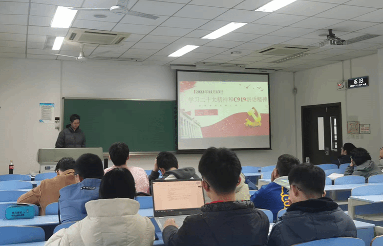 首先,张哲领学了习近平总书记在中国共产党第二十次全国代表大会上的报告、习近平总书记会见C919大型客机项目团队代表并参观项目成果展览时的重要讲话和中共中央国务院贺电精神,传达了学校党委学生工作部关于组织开展“青春献礼二十大,强国有我新征程”主题党日活动的通知。