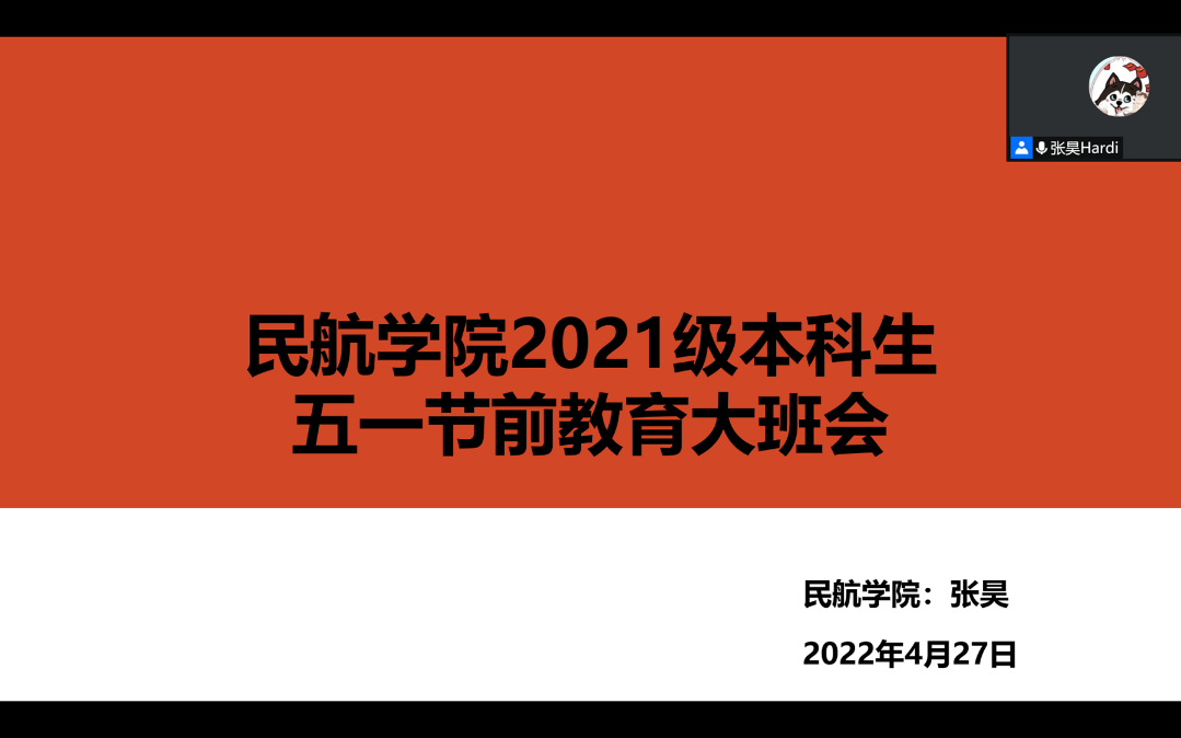 2022年4月27日晚,304永利集团官网入口通过线上会议召开2021级本科生五一假期安全教育暨学风建设大班会,学院21级本科生辅导员张昊及全体2021级本科生参会。
