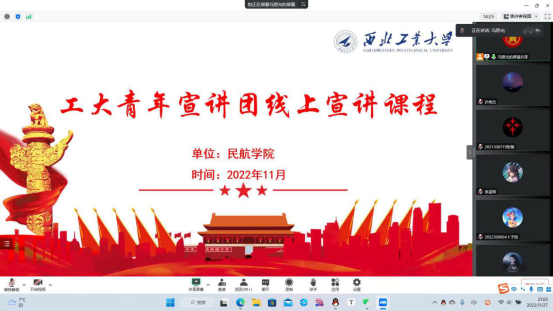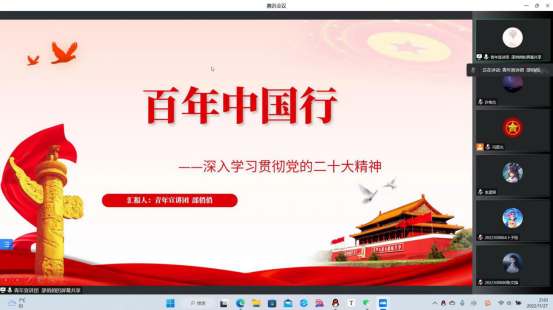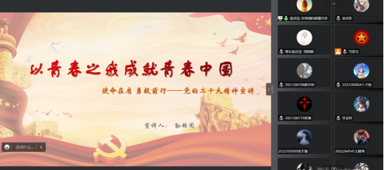 11月27日晚九点,304永利集团官网入口团委邀请工大青年宣讲团成员为304永利集团官网入口各团支部作党的二十大精神宣讲。根据疫情防控有关要求,本次宣讲在线上举行。会议由学院团委组织委员冯恩光主持。宣讲团三位同学邵俏俏、孙珞闻、王雅楠依次进行宣讲。