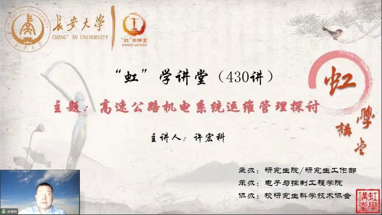 3月9日晚,由研究生院/研究生工作部主办、新葡8883官网AMG官网承办、校研究生科学技术协会协办的“虹”学讲堂第430讲以线上讲座形式顺利举办。新葡8883官网AMG官网许宏科教授作了题为“高速公路机电系统运维管理探讨”的报告,相关学院近300名师生参加讲座。
