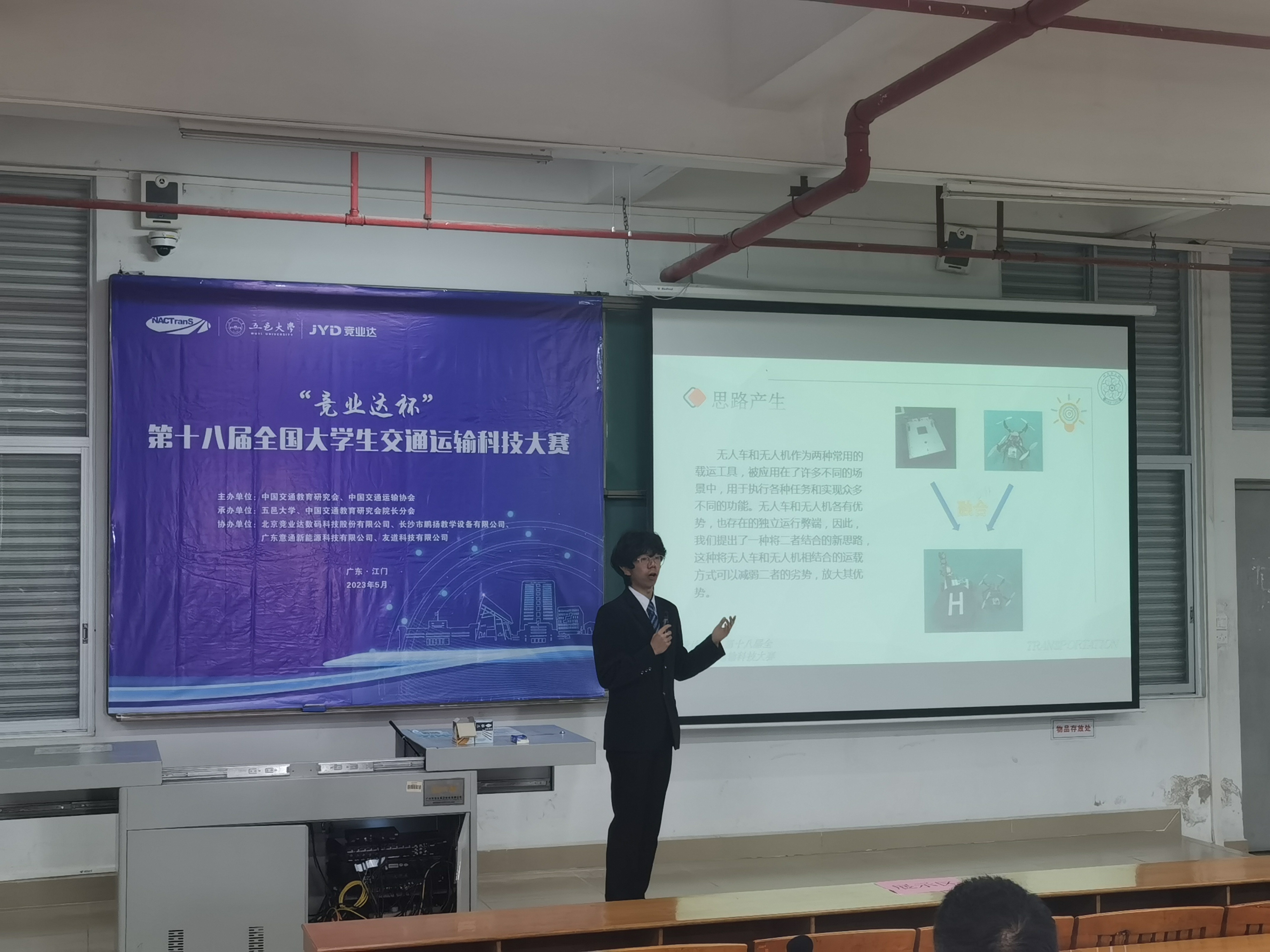5月28日,第十八届全国大学生交通运输科技大赛总决赛在广东江门落下帷幕。本次大赛共吸引了全国1000余支高校队伍参赛,经过层层选拔共235件作品入围全国总决赛。新葡8883官网AMG官网黄鹤教授指导的研究生谢飞宇、胡凯益、温夏露、李东强、马浩然组队参赛,经过五个月的精心筹备,参赛作品《陆空协同车-机载运融合系统》在“第一届陕西省大学生交通科技大赛”中获得省级一等奖,并入围总决赛。经过实验测试、线上选拔、现场答辩等环节,新葡官网团队最终获得全国二等奖。