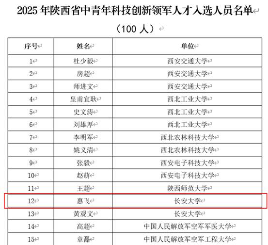 近日,陕西省科学技术厅发布了《关于公布2025年陕西省中青年科技创新领军人才、科技创新创业人才及2026年青年科技新星入选人员的通知》(陕科人才函〔2025〕355号),新葡官网惠飞教授入选2025年陕西省中青年科技创新领军人才。