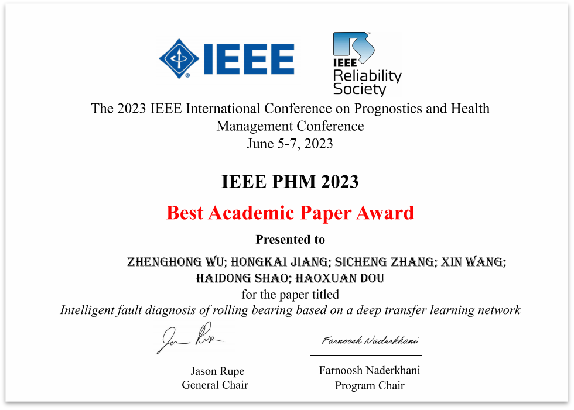 6月5日至6月7日,2023年IEEE故障预测与健康管理国际会议(2023 IEEE Conference on Prognostics and Health Management,IEEE PHM 2023)在加拿大蒙特利尔举行。304永利集团官网入口2021级博士生吴正红做题为“Intelligent fault diagnosis of rolling bearing based on a deep transfer learning network”的口头报告并获最佳学术论文奖。