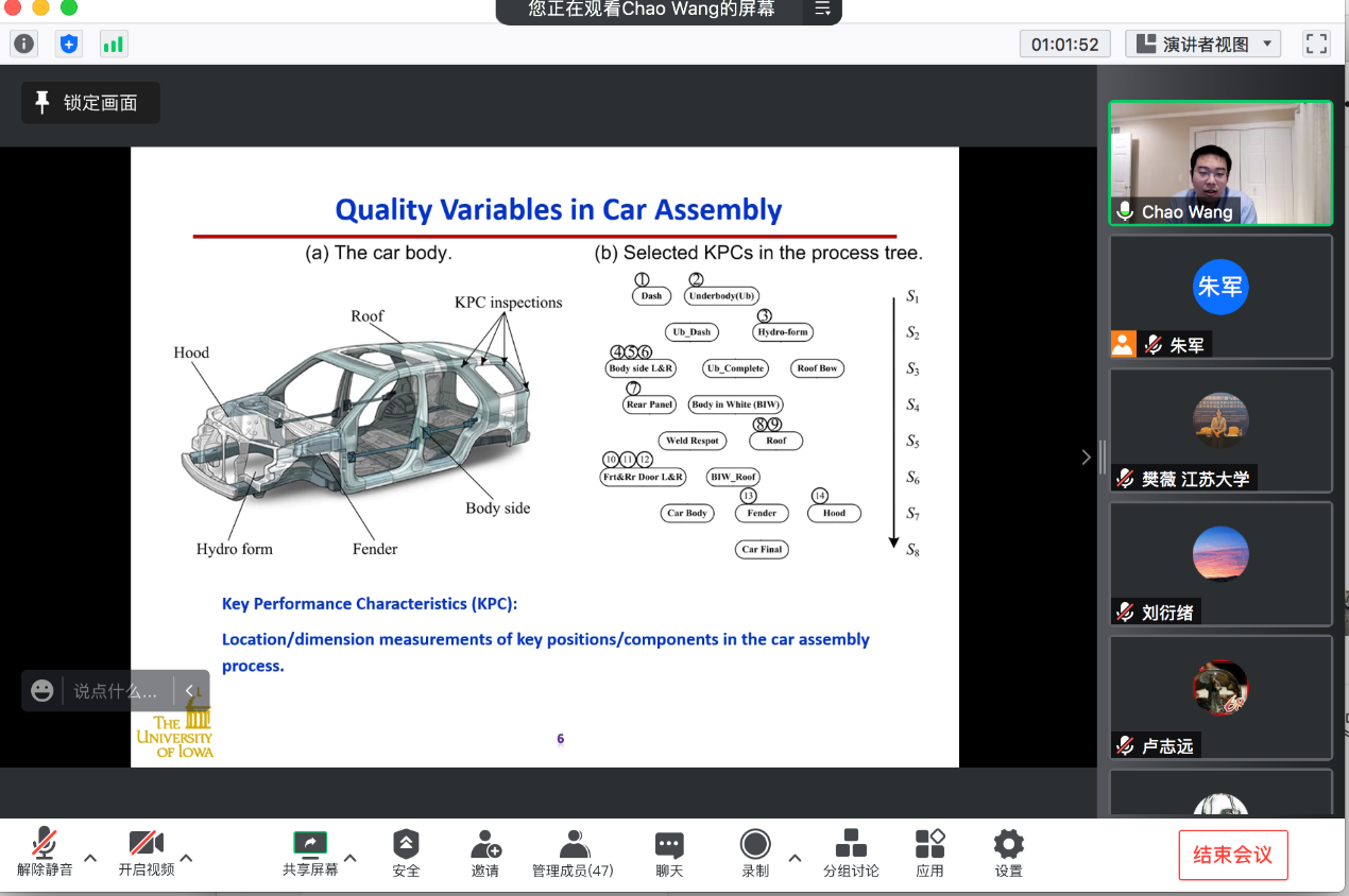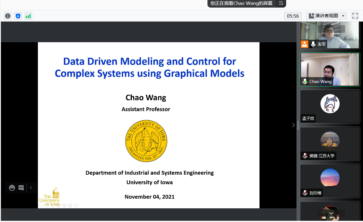 2021年11月4日上午,美国爱荷华大学工业系统工程系王超助理教授应邀至304永利集团官网入口作题为“概率图模型在复杂系统数据驱动建模和控制中的应用”的线上讲座。讲座由304永利集团官网入口朱军副教授主持。