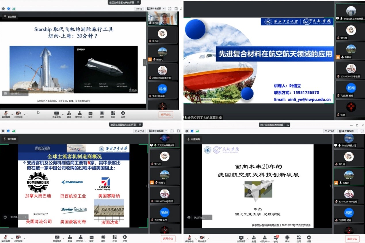 为丰富本科生疫情期间的文化生活,拓展学生视野,激发学习热情,304永利集团官网入口于2022年1月4日14:00,在腾讯会议线上举办了本科生系列讲座第一讲,近 200名本科生线上参加了讲座。“民用航空发动机设计理念与技术发展”、“先进复合材料在航空航天领域的应用”、“大飞机总体技术发展”、“航空航天未来二十年发展”先后由王光秋教授,叶信立副教授,党庆庆助理教授以及陈杰副教授主讲,学院教学副院长张晓化主持。