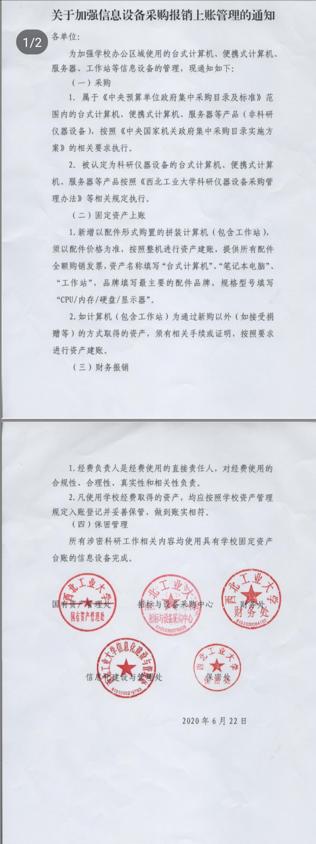 学校国有资产管理处、招标与设备采购中心、财务处、信息化建设与管理处、保密处联合发文,关于加强信息设备采购报销上账管理的通知。
